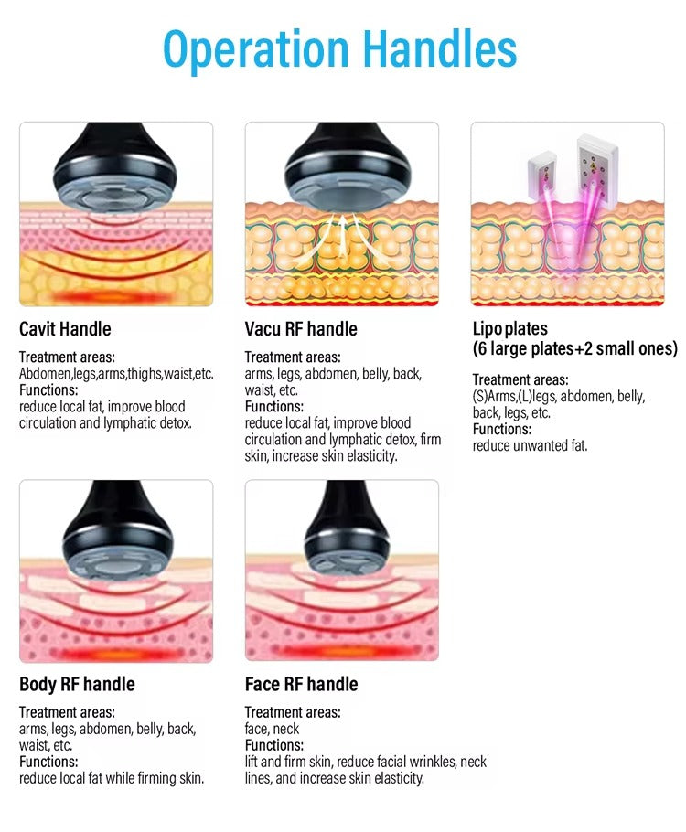 Capătul de Cavitație cu Radiofrecvență este specializat pentru remodelarea corporală și îmbunătățirea aspectului pielii. Procesul de cavitație utilizează ultrasunete de frecvență joasă la 40KHz și putere de 25W, pentru a genera microbule care dizolvă grăsimile localizate și transformă celulele grase în substanțe lichide, ușor de eliminat. Combinat cu radiofrecvența, care operează la 66V și 4MHz cu o putere de 40W, acest capăt sporește producția de colagen și îmbunătățește fermitatea cutanată, reducând vizibil aspectul celulitei și oferind un ten neted și tonifiat.