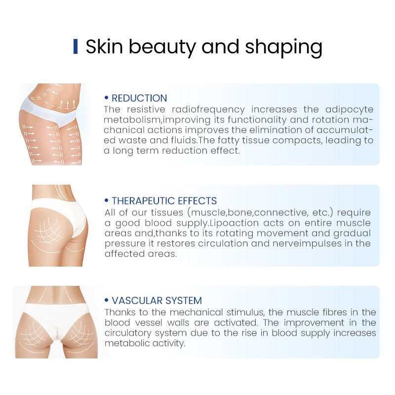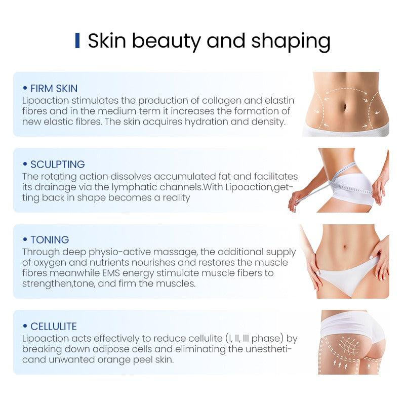Functia de Masaj Mecanic Rollaction utilizează un masaj profund menit să stimuleze țesuturile, să îmbunătățească drenajul limfatic și să reducă celulita. Prin această abordare, pielea devine netedă, iar circulația sanguină și eliminarea toxinelor sunt îmbunătățite. În scenarii de salon, această funcție este deosebit de utilă pentru tratarea zonelor cu celulită persistentă și grăsime subcutanată, sprijinind astfel eficiența operațională prin rezultate vizibile și rapide.