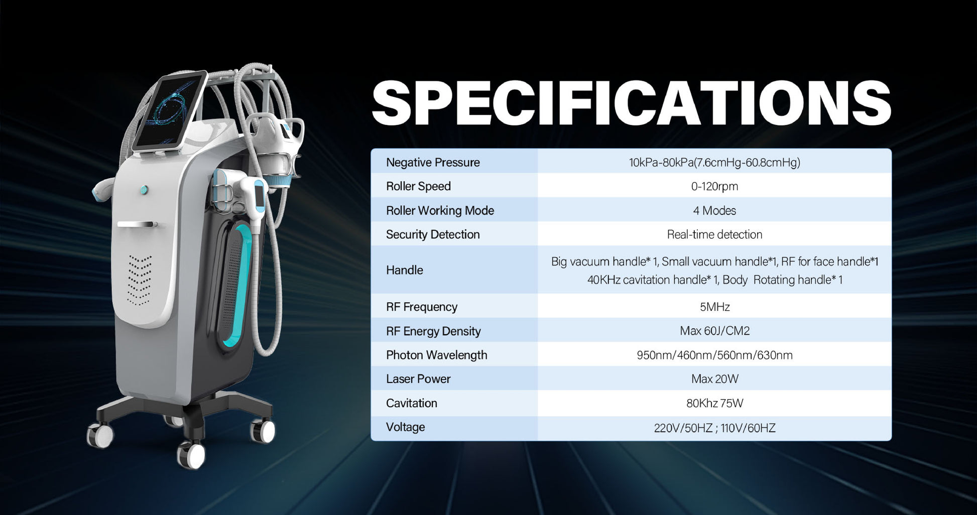 • Cavitație ultrasonică (80kHz) – dizolvă grăsimea localizată, ajutând la reducerea circumferinței și la remodelarea siluetei.